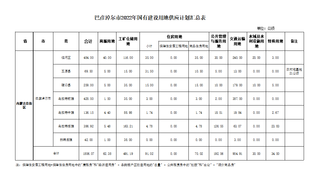 巴彦淖尔市2022年国有建设用地供应计划汇总表