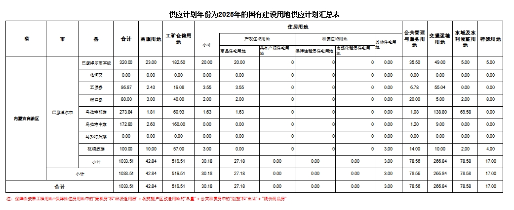供应计划年份为2025年的国有建设用地供应计划汇总表