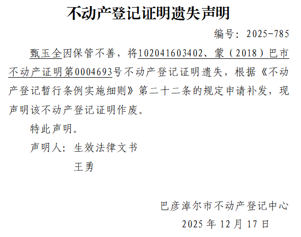 不动产登记证明遗失声明