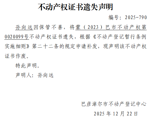 孙向远不动产权证书遗失声明