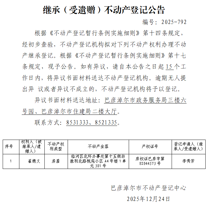 李秀芳继承(受遗赠)不动产登记公告
