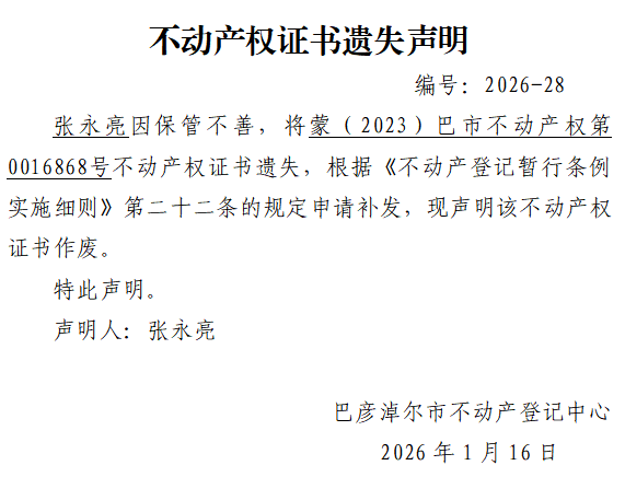 张永亮不动产权证书遗失声明