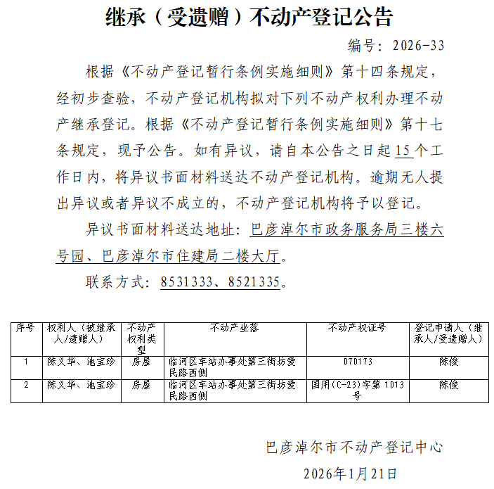 陈俊继承(受遗赠)不动产登记公告