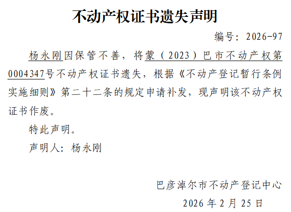 杨永刚不动产权证书遗失声明