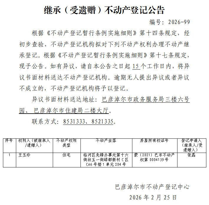 张磊继承(受遗赠)不动产登记公告