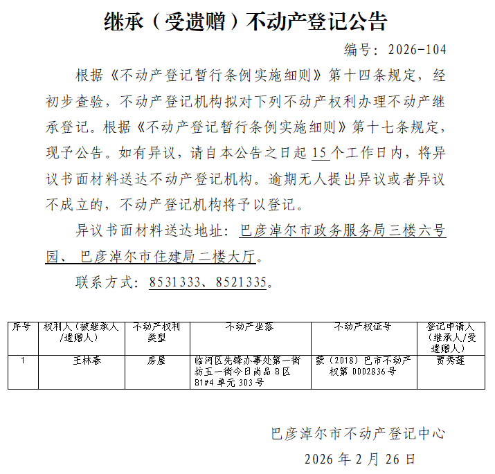 贾秀莲继承(受遗赠)不动产登记公告