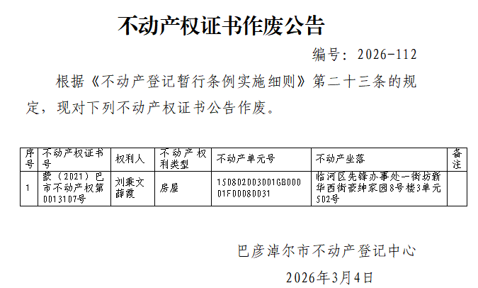 刘秉文、薛霞不动产权证书作废公告