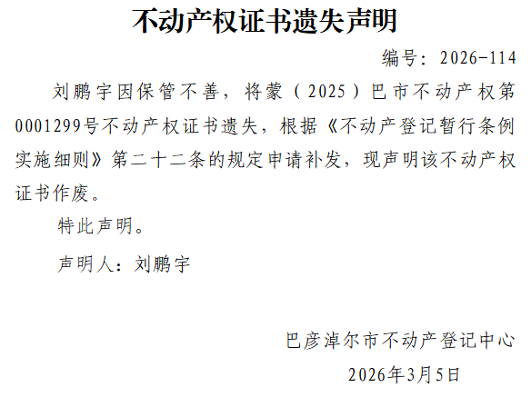 刘鹏宇不动产权证书遗失声明