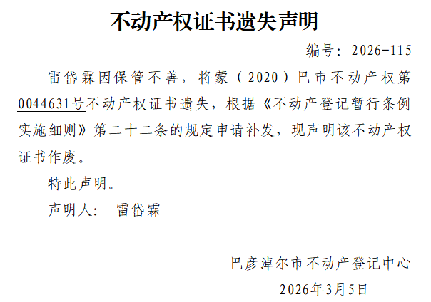 雷岱霖不动产权证书遗失声明