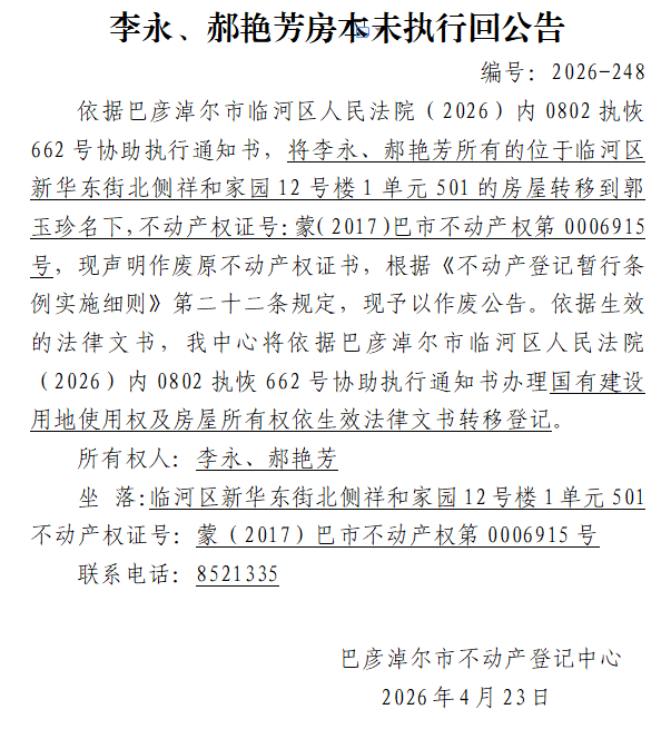 李永、郝艳芳房本未执行回公告