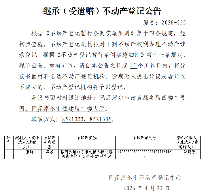 邬瑞芳继承(受遗赠)不动产登记公告
