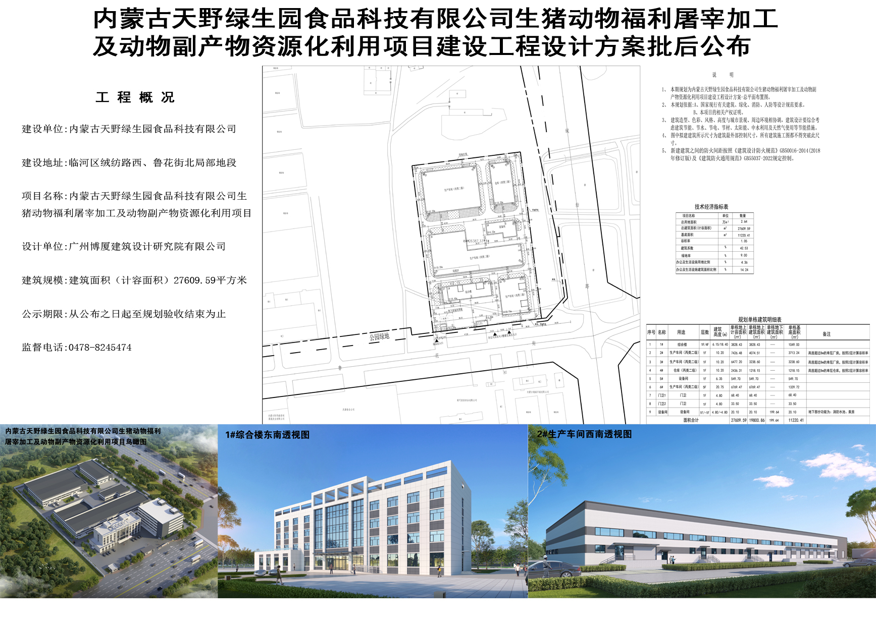 内蒙古天野绿生园食品科技有限公司生猪动物福利屠宰加工及动物副产物资源化利用项目建设工程设计方案批后公布