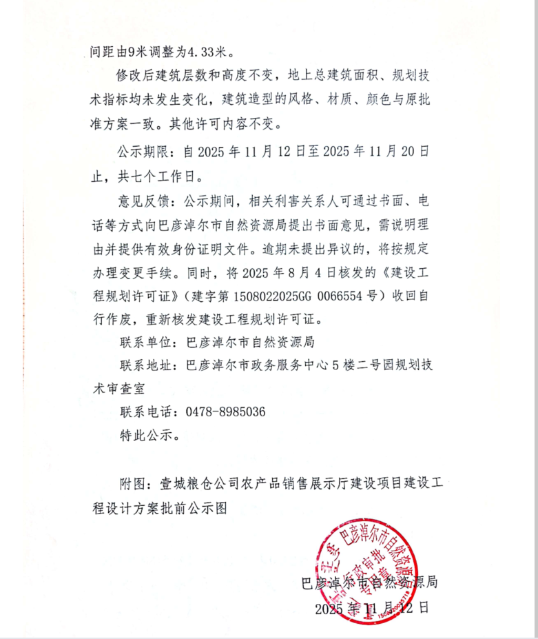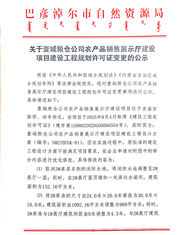 关于壹城粮仓公司农产品销售展示厅建设项目建设工程规划许可证变更的公示
