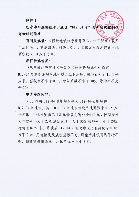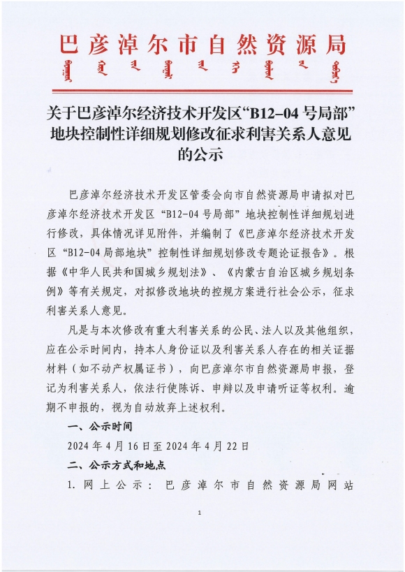 关于巴彦淖尔市经济技术开发区“B12-04号局部”地块控制性详细规划修改征求利害关系人意见的公示