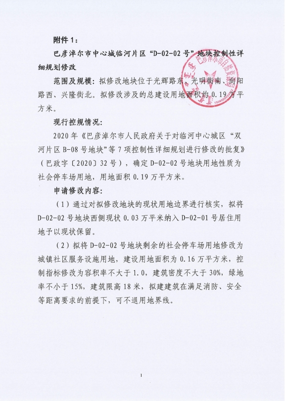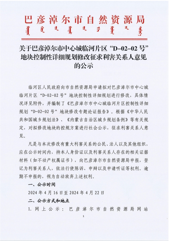关于巴彦淖尔市中心城临河片区“D-02-02号”地块控制性详细规划修改征求利害关系人意见的公示