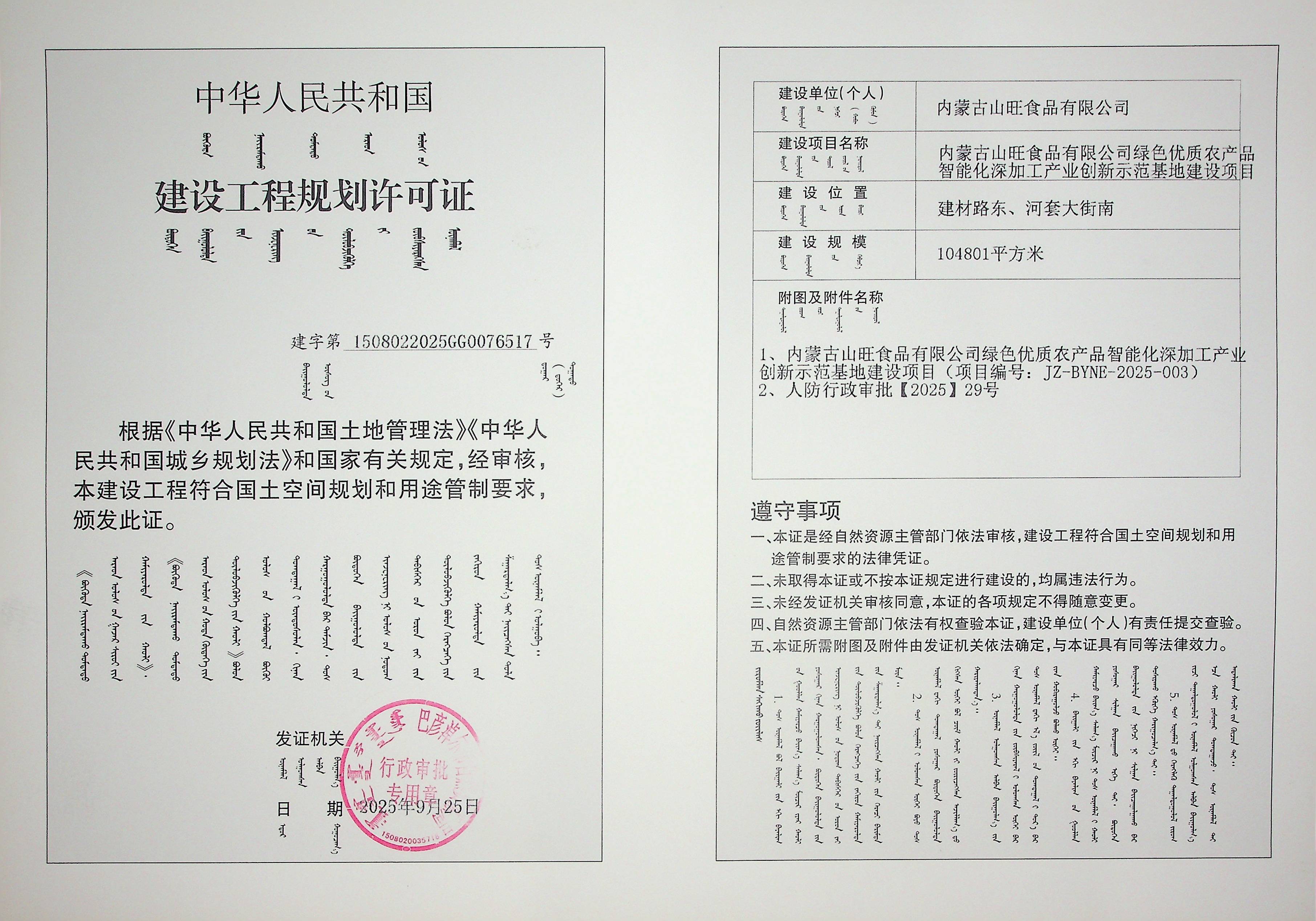 内蒙古山旺食品有限公司绿色优质农产品智能化深加工产业创新示范基地建设项目(建设工程规划许可证)