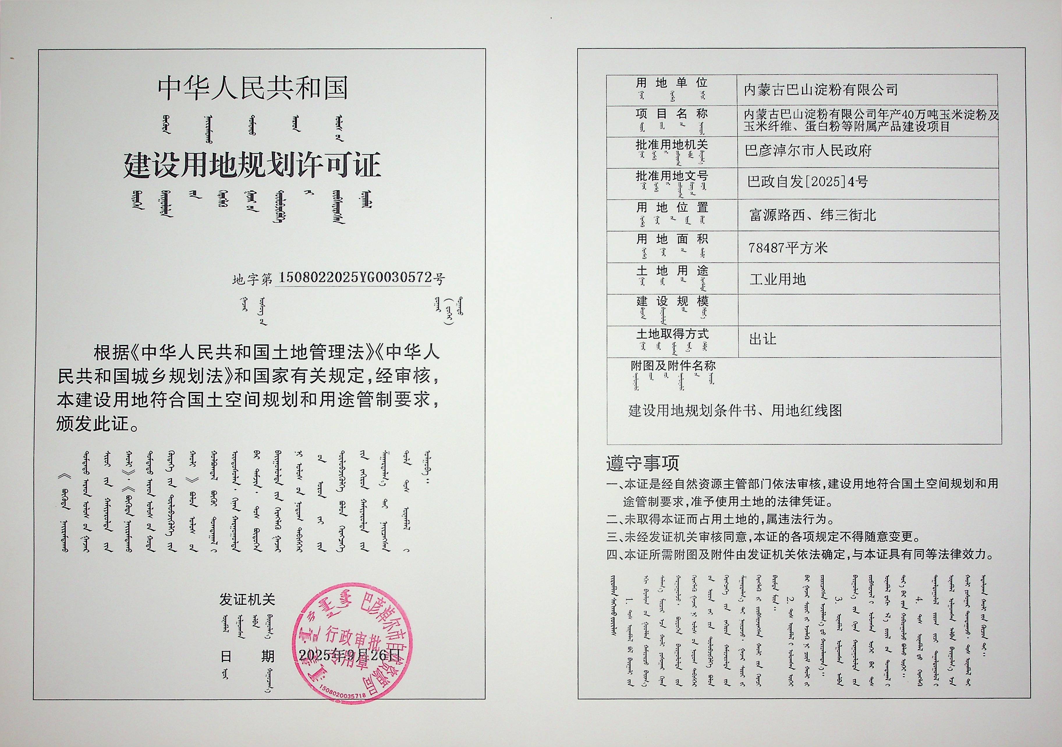 内蒙古巴山淀粉有限公司年产40万吨玉米淀粉及玉米纤维、蛋白粉等附属产品建设项目(建设用地规划许可证)