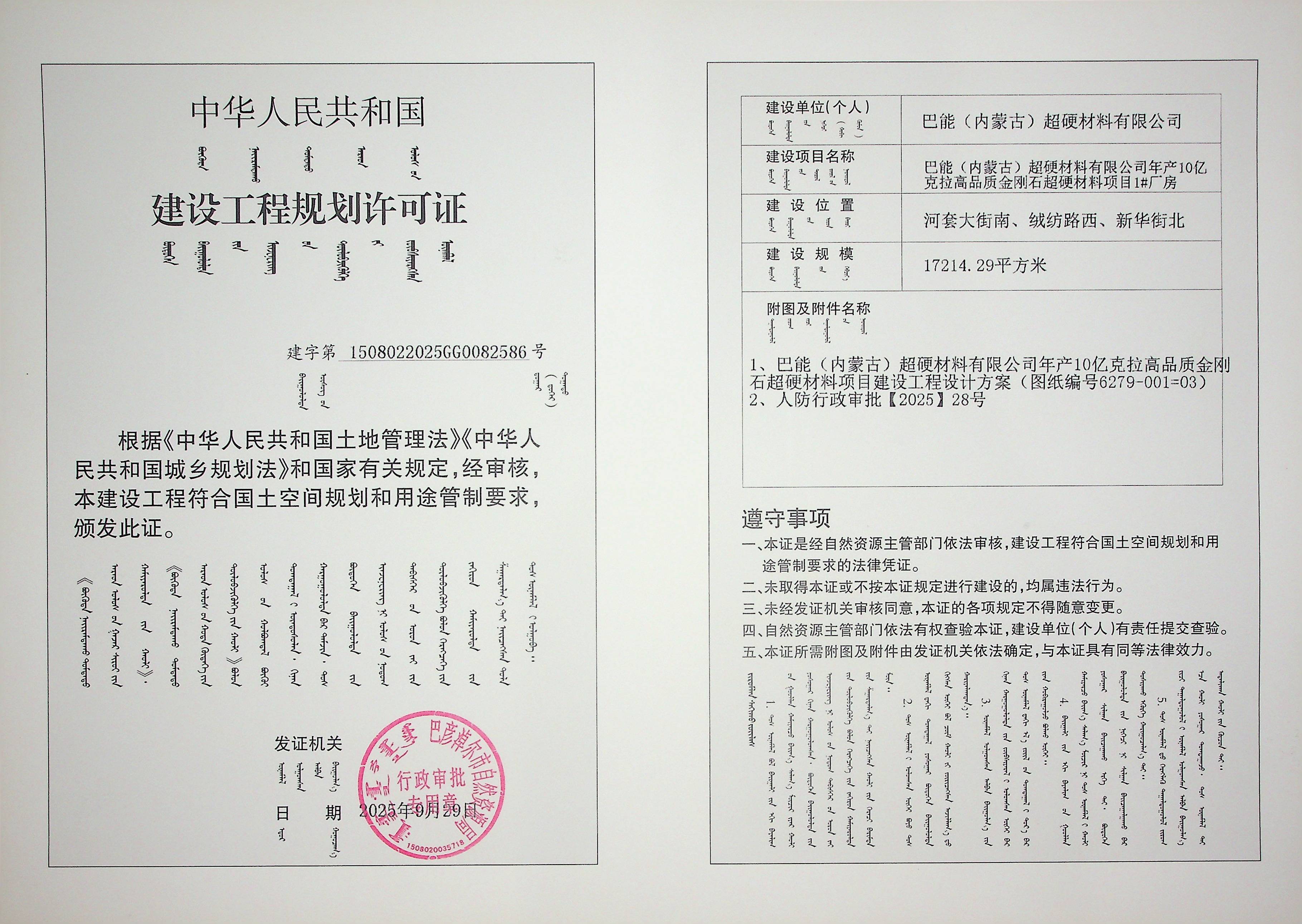 巴能(内蒙古)超硬材料有限公司年产10亿克拉高品质金刚石超硬材料项目1#厂房(建设工程规划许可证)