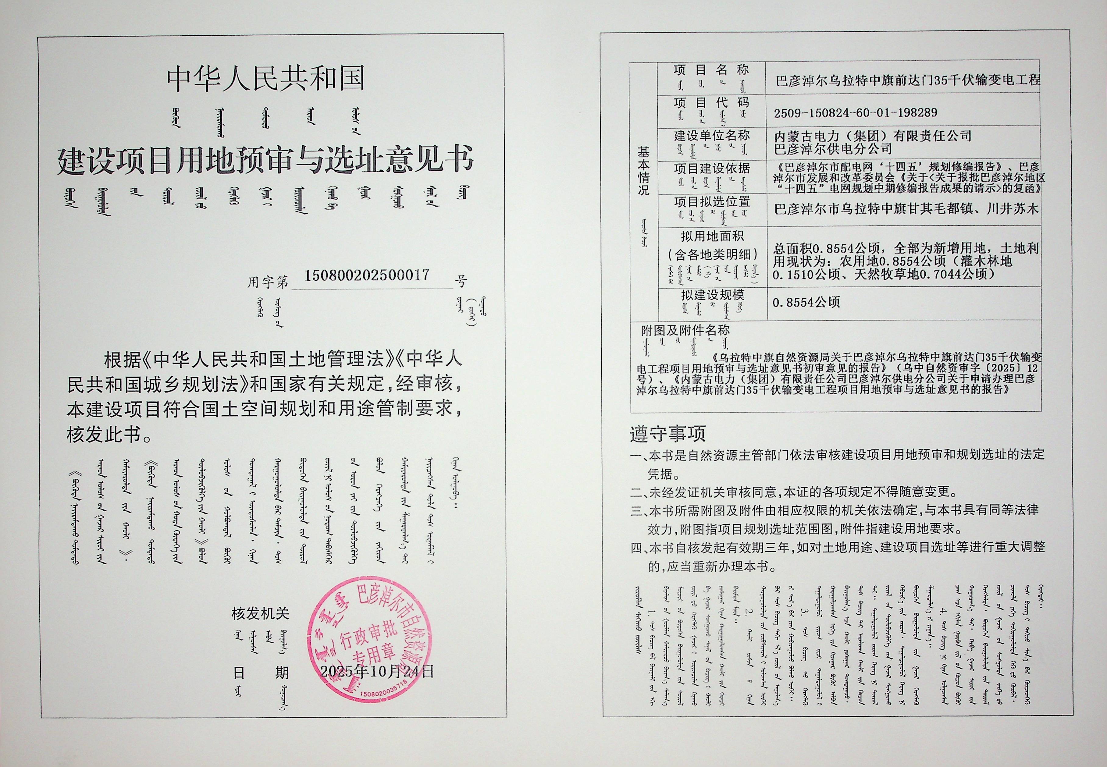 巴彦淖尔乌拉特中旗前达门35千伏输变电工程(建设项目用地预审与选址意见书)