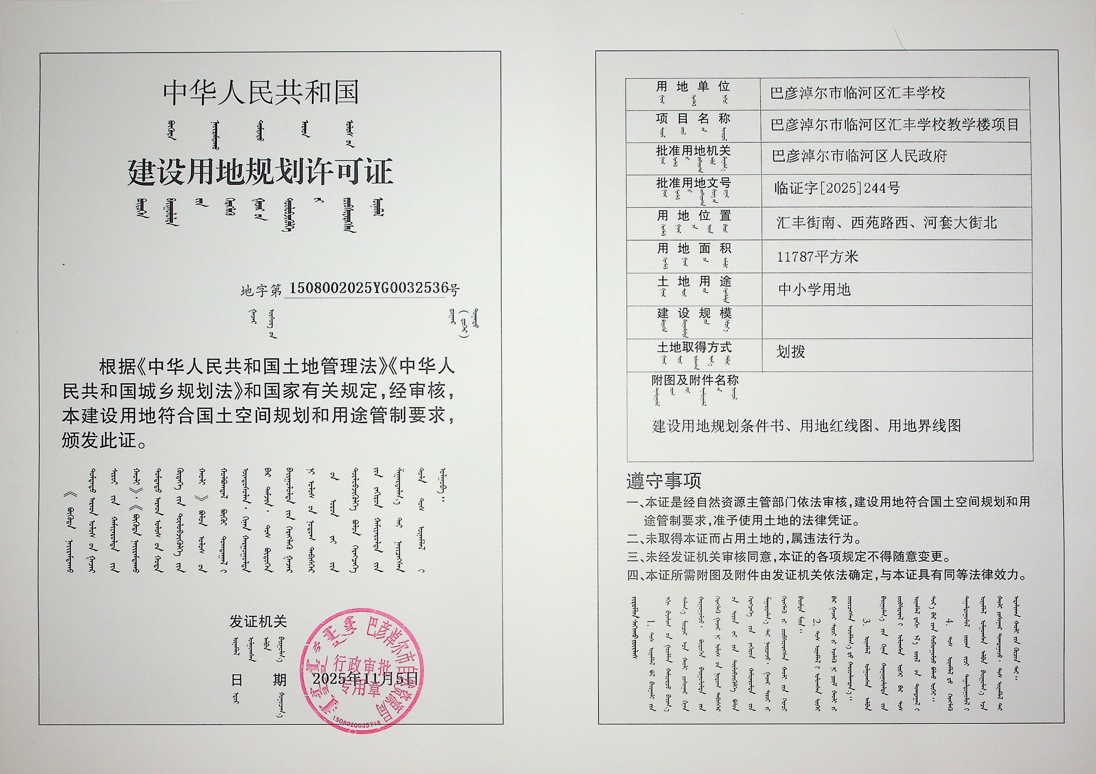 巴彦淖尔市临河区汇丰学校教学楼项目(建设用地规划许可证)