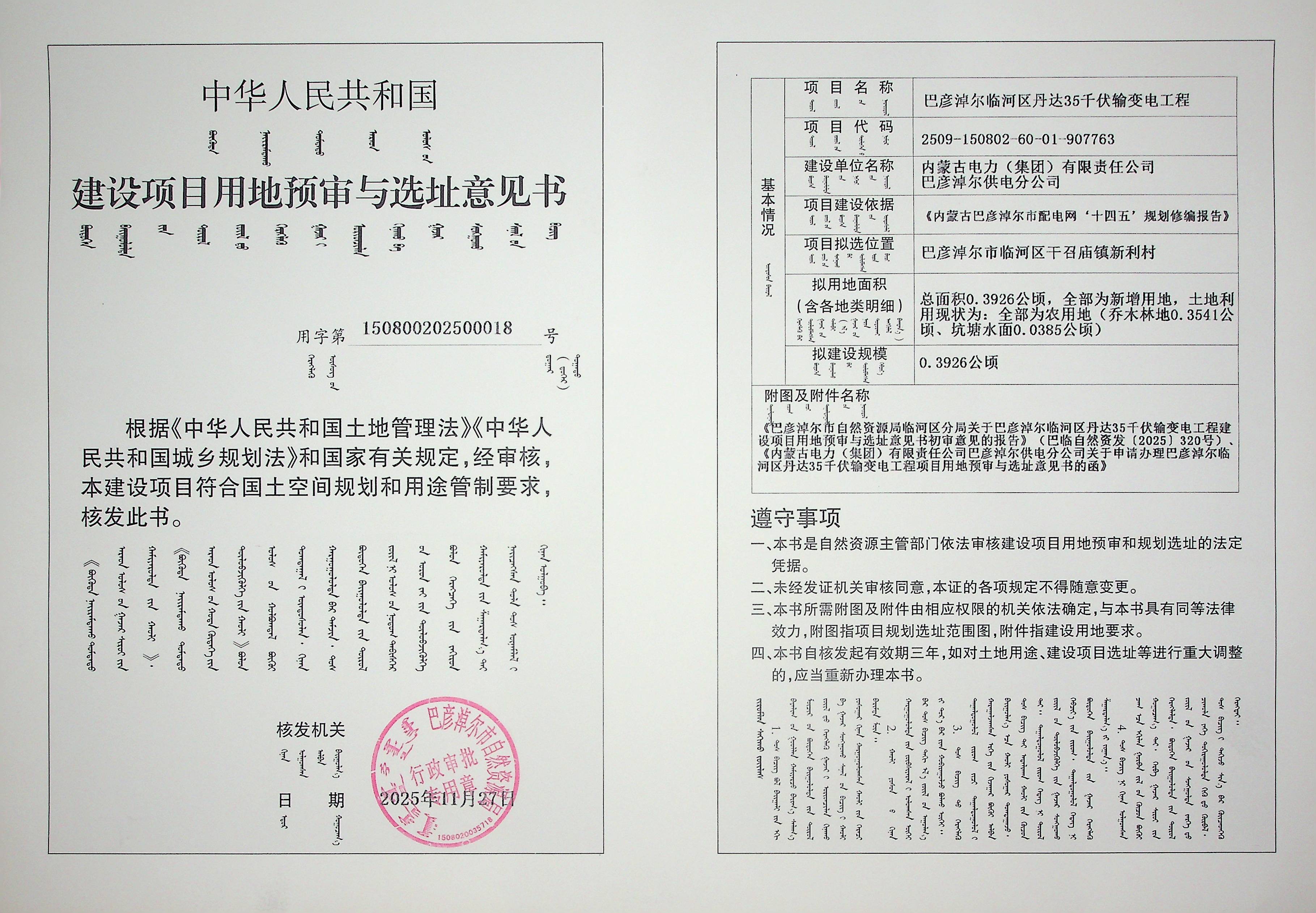 巴彦淖尔临河区丹达35千伏输变电工程(建设项目用地预审与选址意见书)