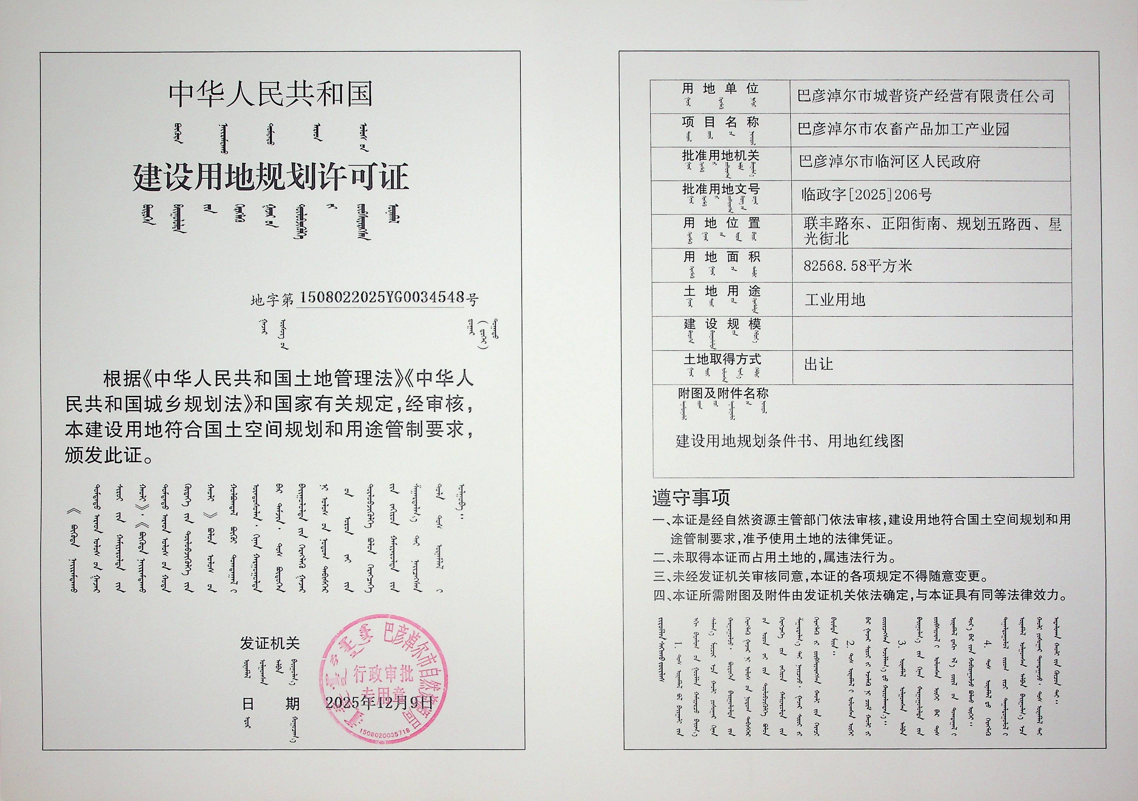 巴彦淖尔市农畜产品加工产业园(建设用地规划许可证)