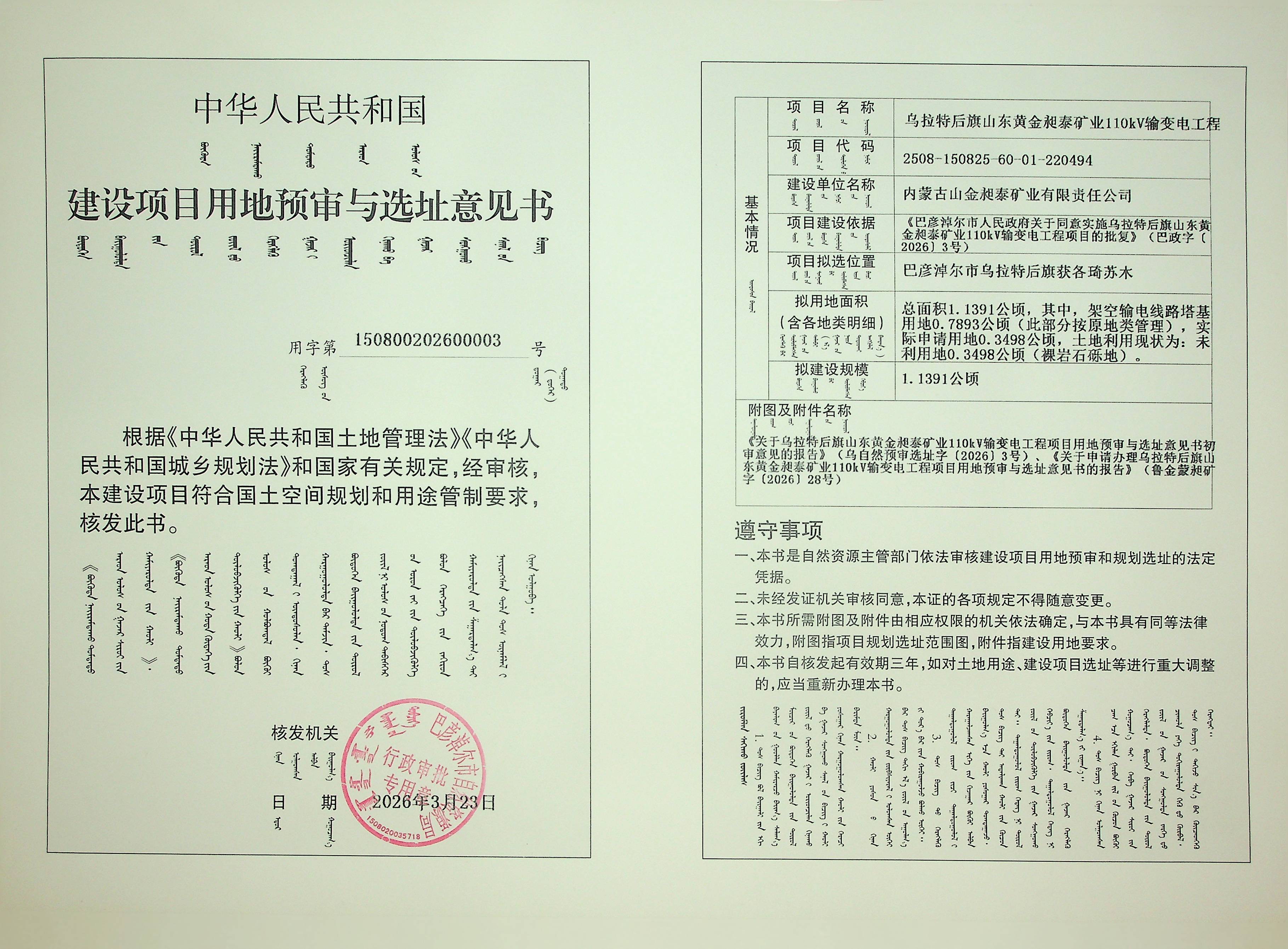 乌拉特后旗山东黄金昶泰矿业110kV输变电工程(建设项目用地预审与选址意见书)