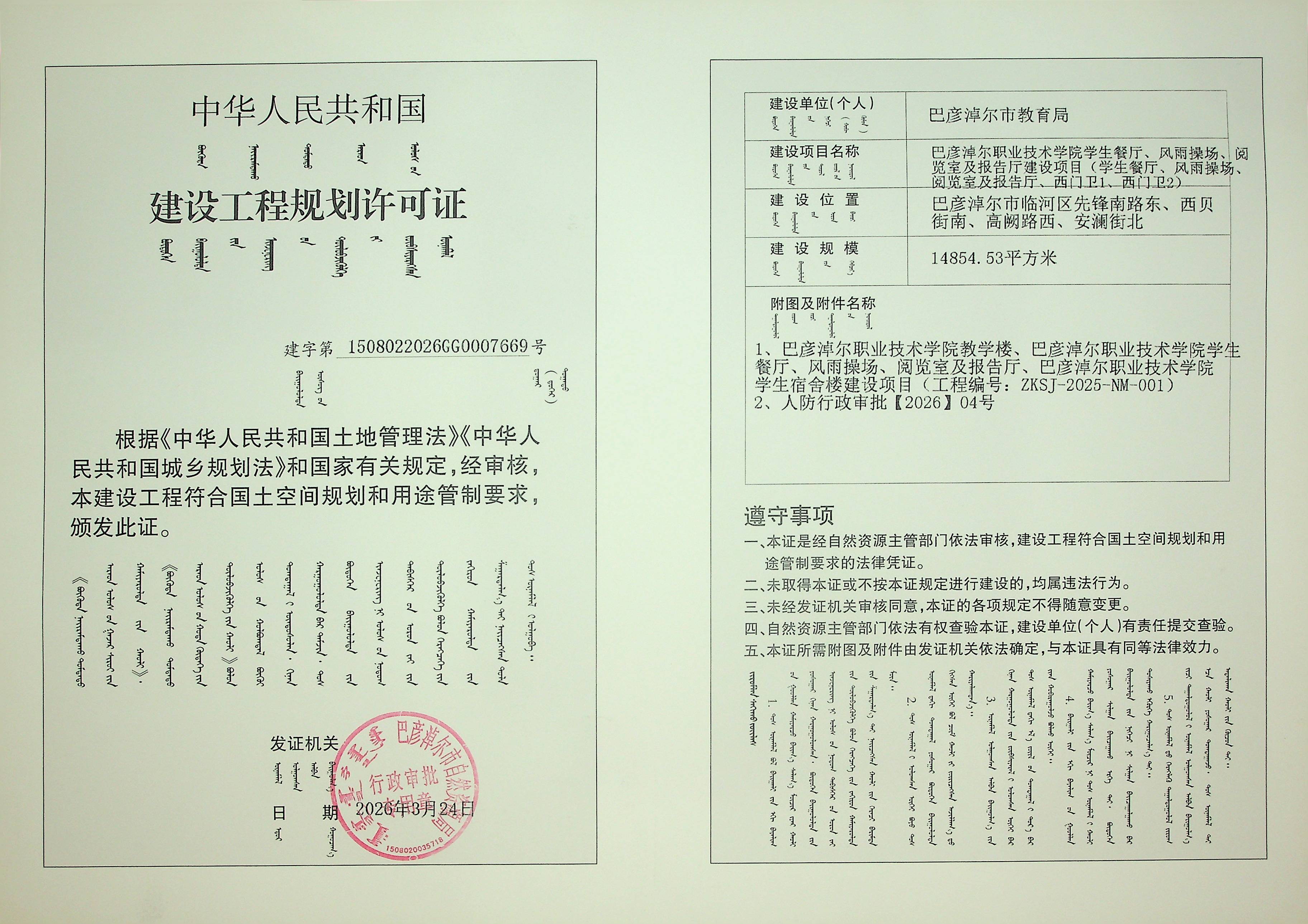 巴彦淖尔职业技术学院学生餐厅、风雨操场、阅览室及报告厅建设项目(学生餐厅、风雨操场、阅览室及报告厅、西门卫1、西门卫2)(建设工程规划许可证)