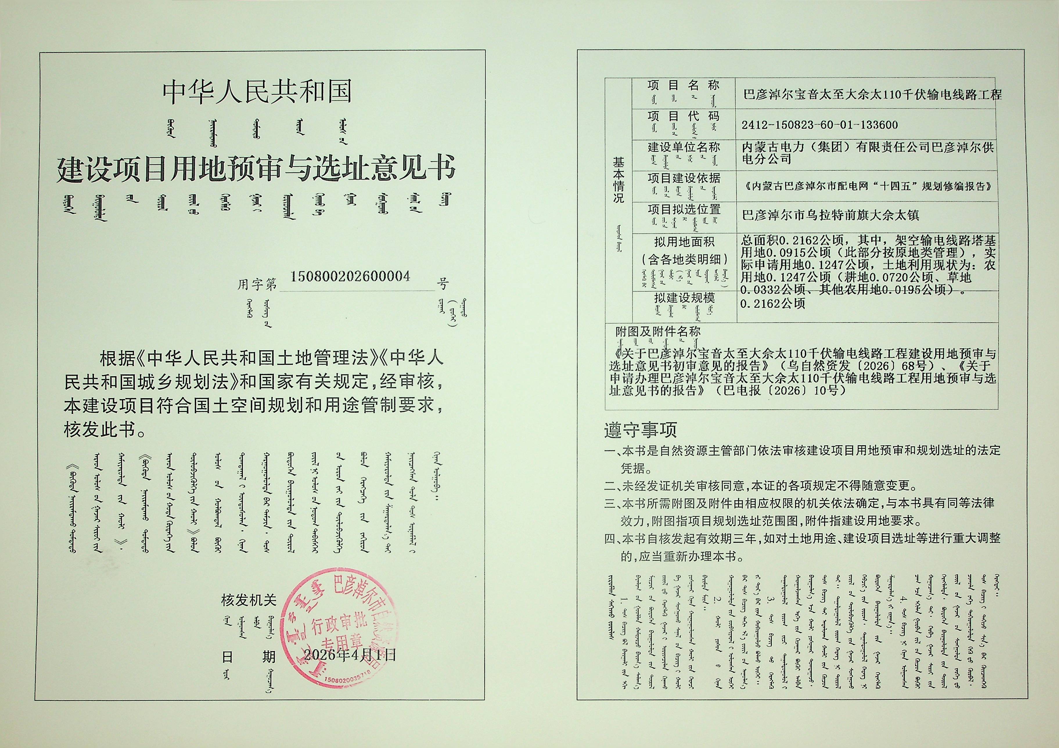巴彦淖尔宝音太至大佘太110千伏输电线路工程(建设项目用地预审与选址意见书)