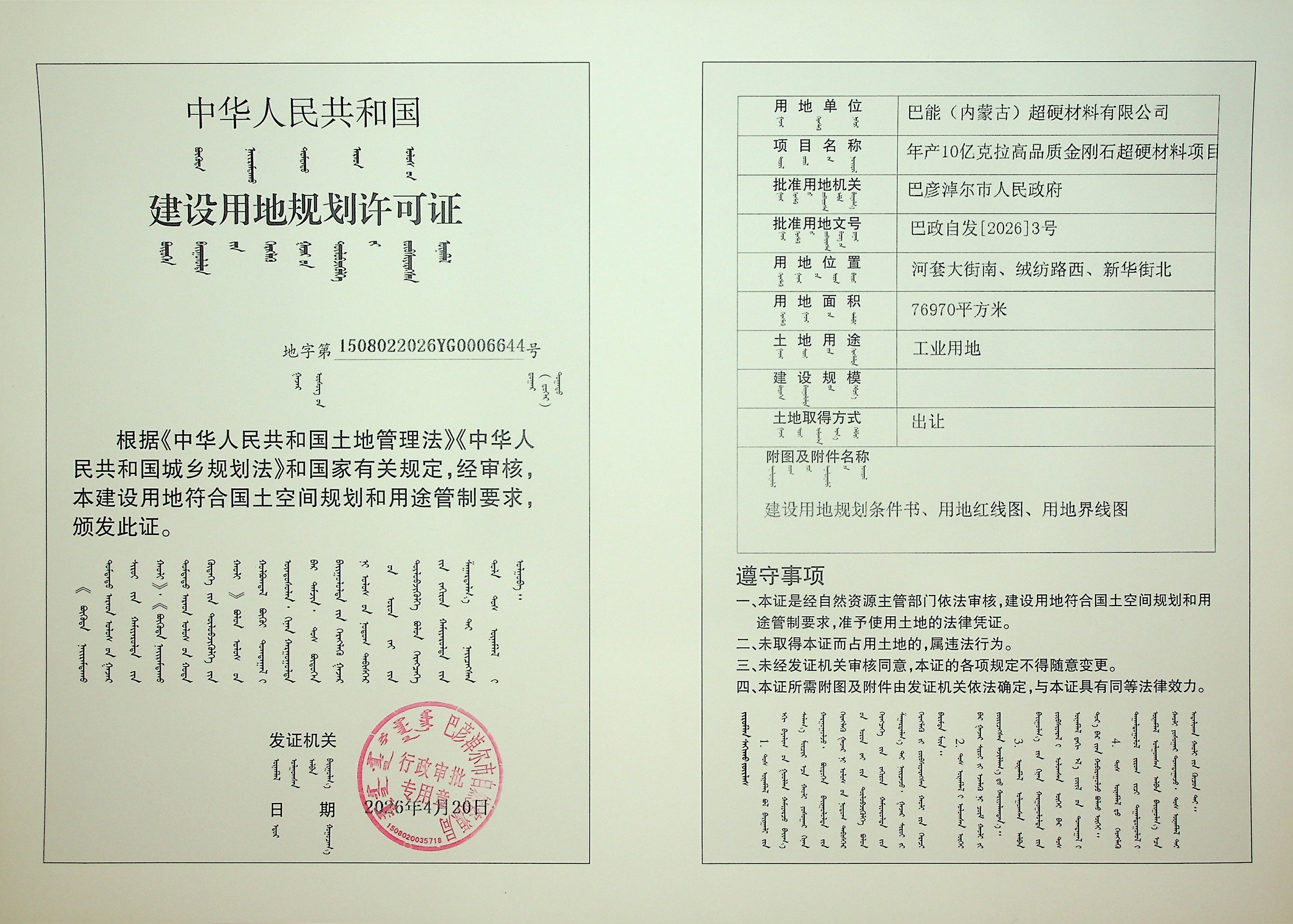 年产10亿克拉高品质金刚石超硬材料项目(建设用地规划许可证)