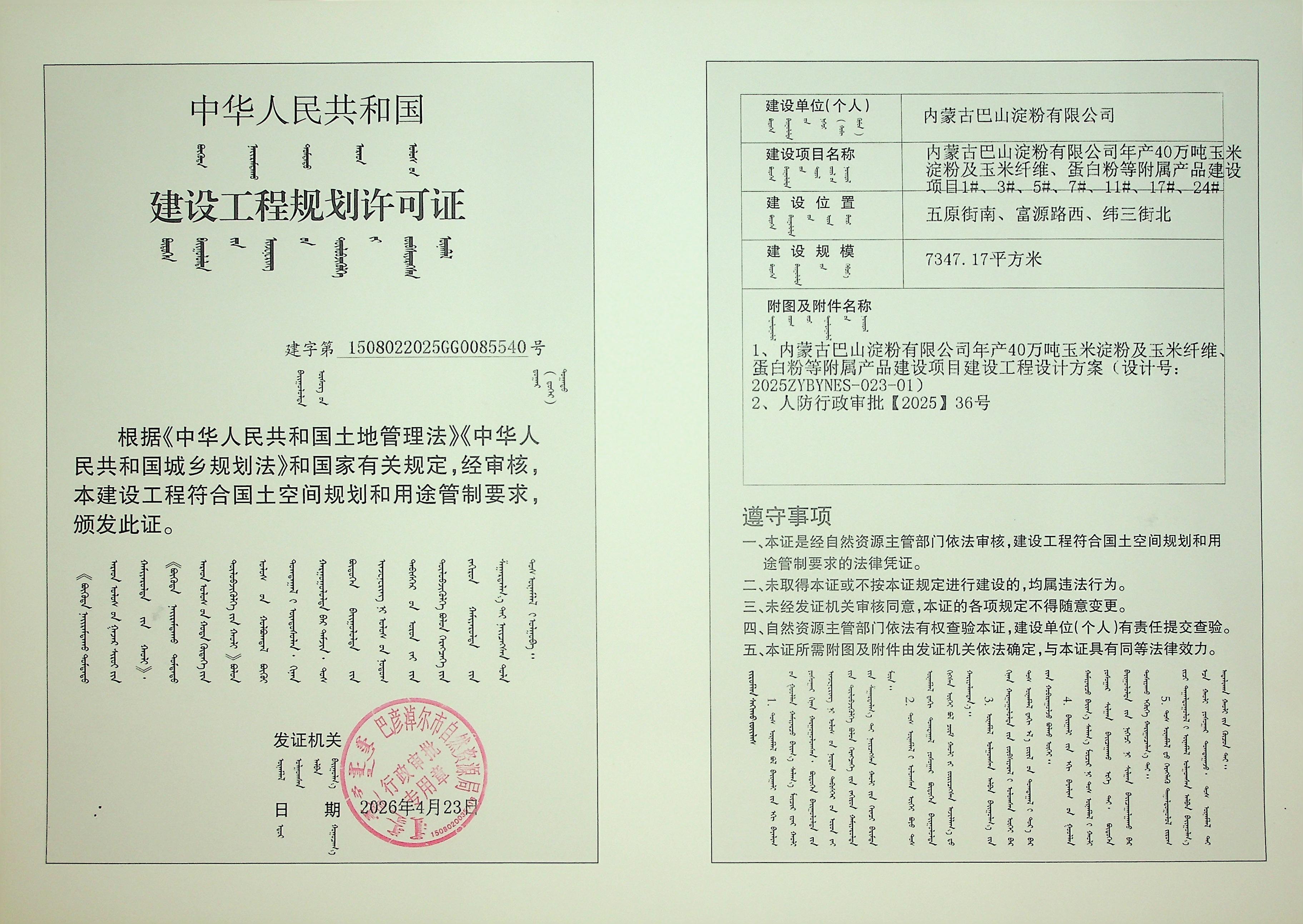 内蒙古巴山淀粉有限公司年产40万吨玉米 淀粉及玉米纤维、蛋白粉等附属产品建设项目1#、3#、5#、7#、11#、17#、24#(建设工程规划许可证)