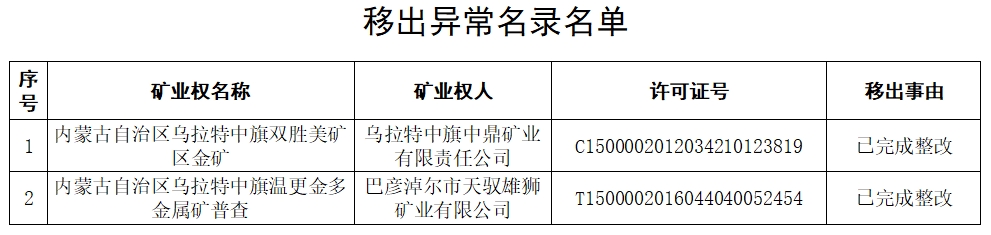 按照《矿业权人勘查开采信息管理办法》(自然资源部令第13号),乌拉特中旗双胜美矿区金矿及内蒙古自治区乌拉特中旗温更金多金属矿普查已完成整改。经研究,决定将其移出矿业权人勘查开采信息公示异常名录。