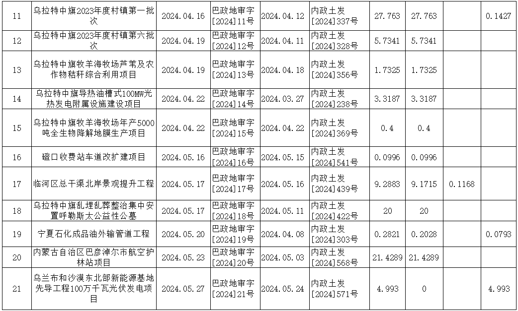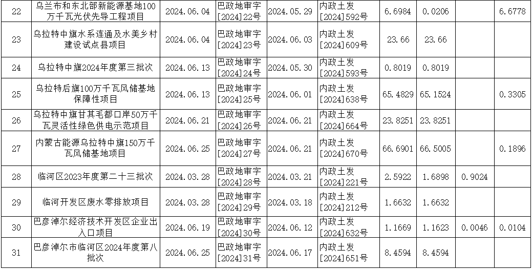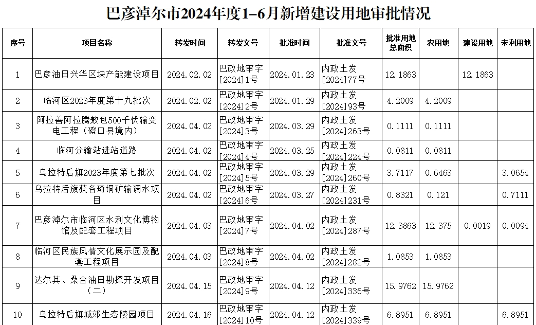 巴彦淖尔市2024年度1-6月新增建设用地审批情况