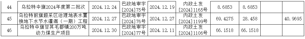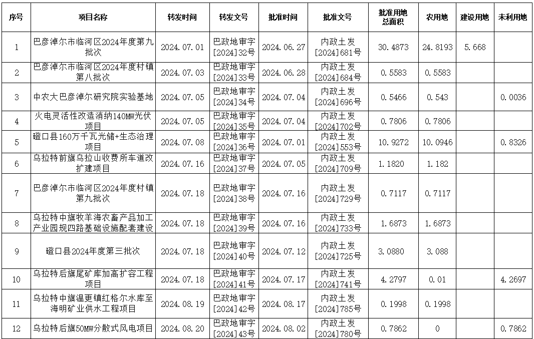 巴彦淖尔市2024年度7-12月新增建设用地审批情况
