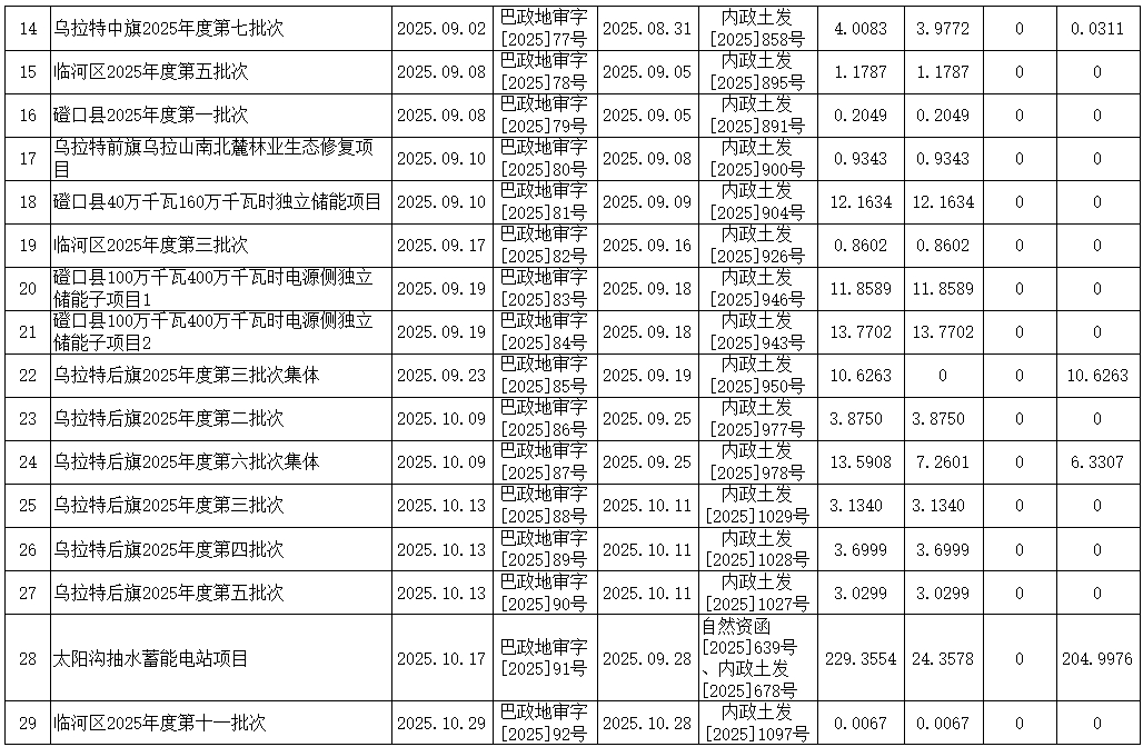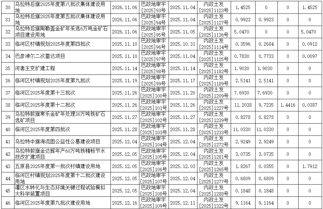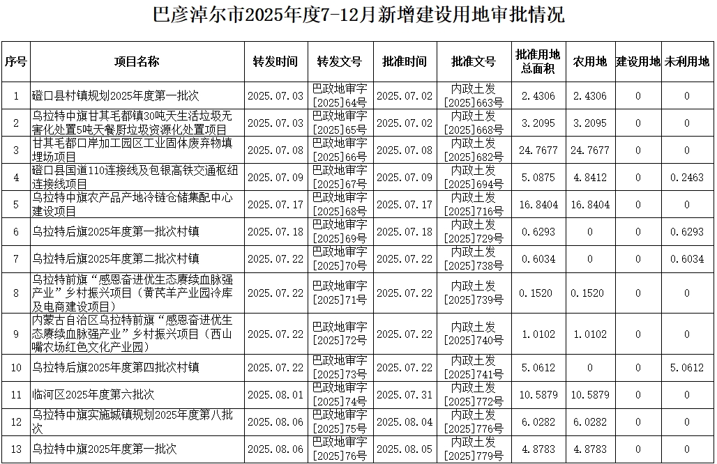 巴彦淖尔市2025年度7-12月新增建设用地审批情况