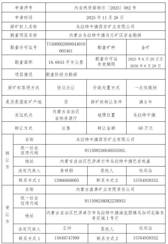 根据《探矿权采矿权转让管理办法》(国务院令242号)、《自然资源部关于印发矿业权出让交易规则的通知》(自然资规〔2023〕1号)等相关规定,现将内蒙古乌拉特中旗乌兰矿区岩金勘探转让有关事项公示如下: