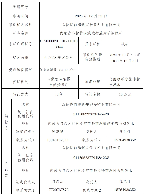 根据《探矿权采矿权转让管理办法》(国务院令242号)、《自然资源部关于印发矿业权出让交易规则的通知》(自然资规〔2023〕1号)等相关规定,现将内蒙古乌拉特前旗达拉盖沟矿区铁矿采矿权转让有关事项公示如下: