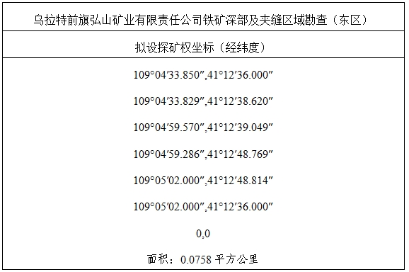 关于乌拉特前旗弘山矿业有限责任公司铁矿深部及夹缝区域勘查(东区)探矿权的协议出让公示