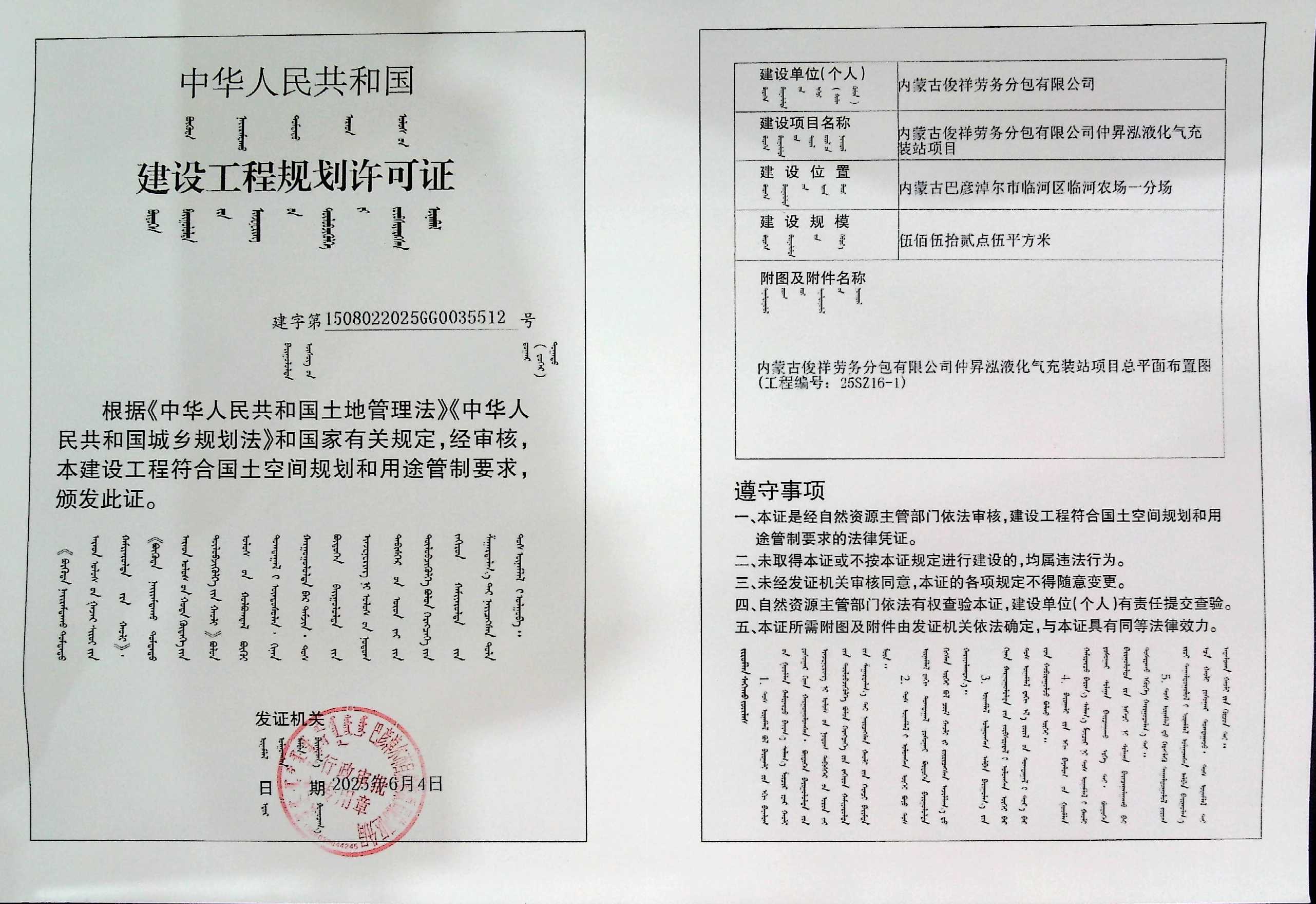 内蒙古俊祥劳务分包有限公司内蒙古俊祥劳务分包有限公司仲昇泓液化气充装站项目(建设工程规划许可证)