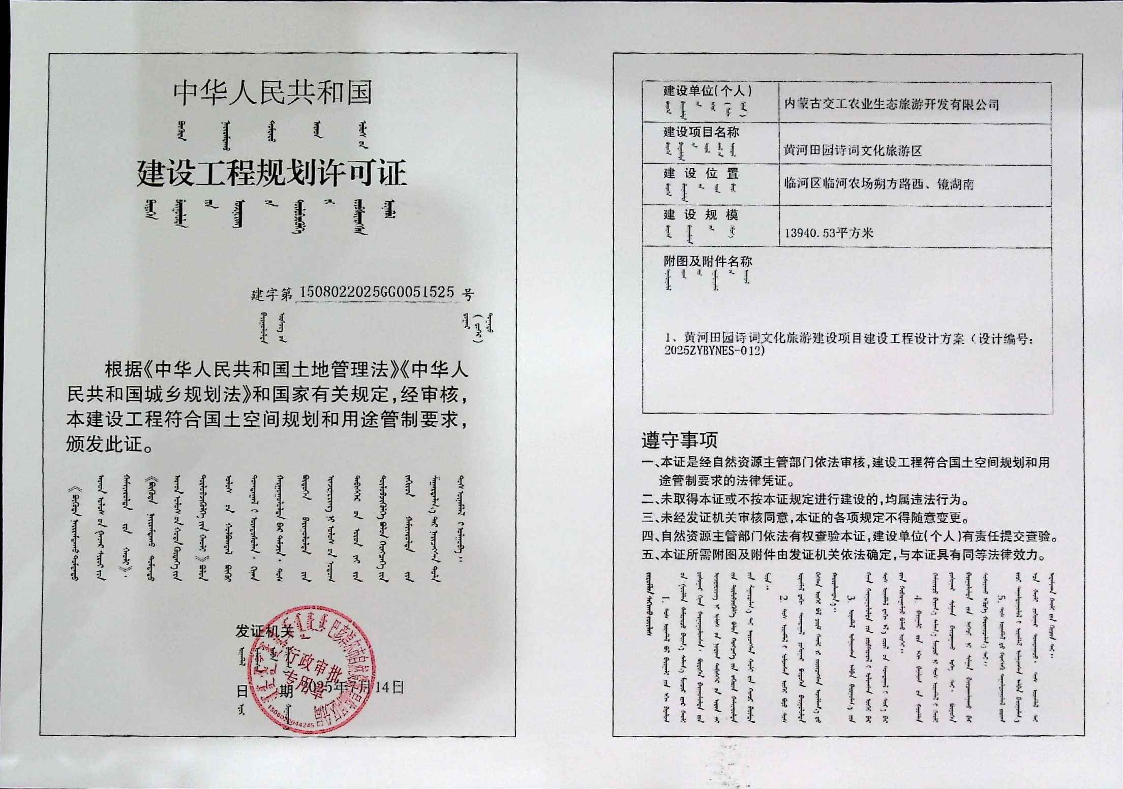 内蒙古交工农业生态旅游开发有限公司黄河田园诗词文化旅游区(建设工程规划许可证)