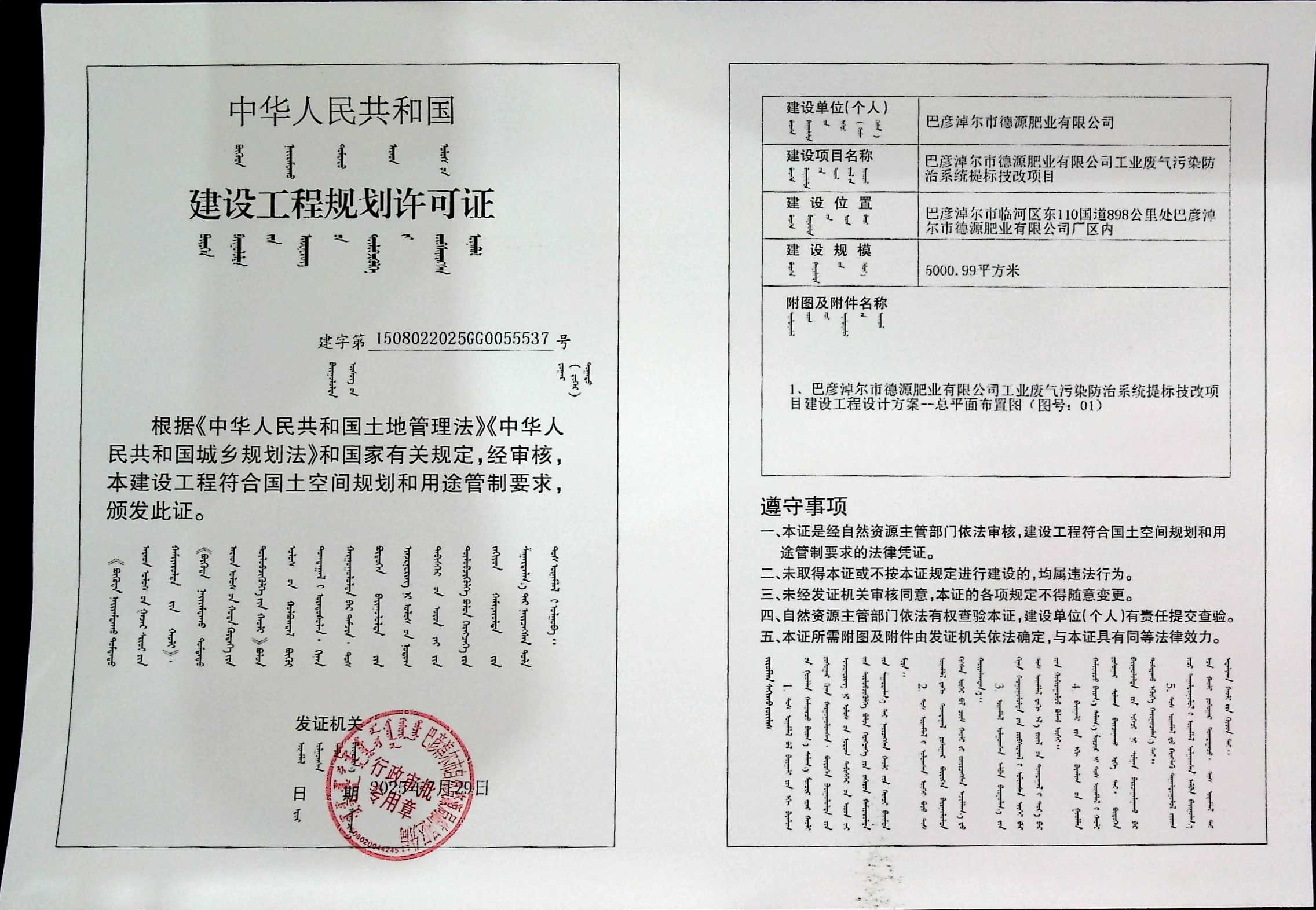 巴彦淖尔市德源肥业有限公司巴彦淖尔市德源肥业有限公司工业废气污染防治系统提标技改项目(建设工程规划许可证)