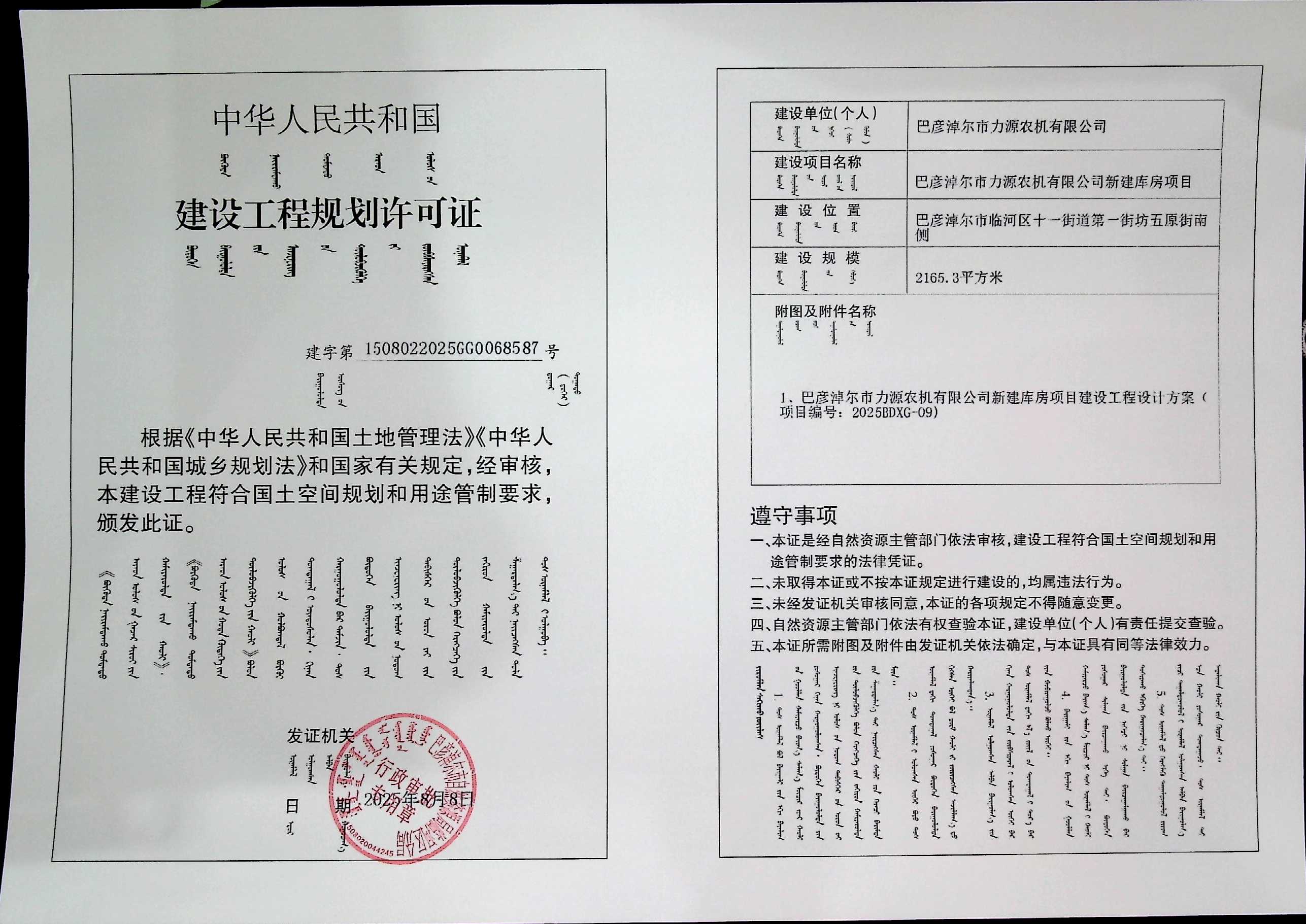 巴彦淖尔市力源农机有限公司巴彦淖尔市力源农机有限公司新建库房项目(建设工程规划许可证)