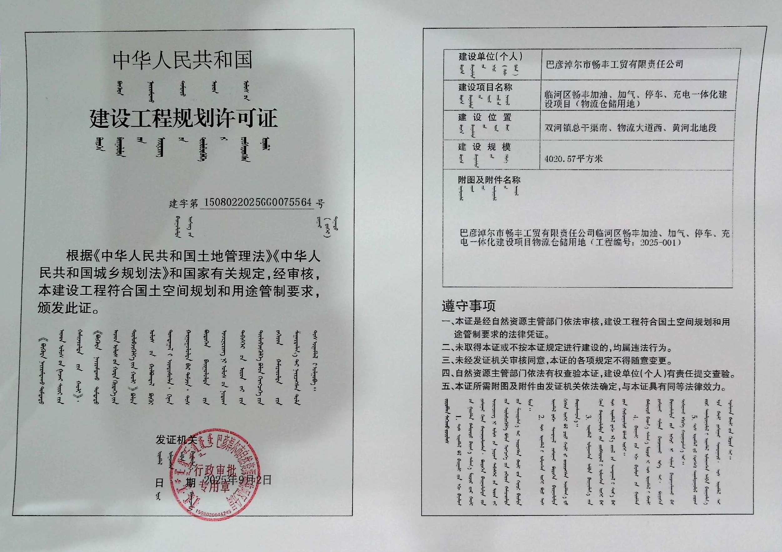 巴彦淖尔市畅丰工贸有限责任公司临河区畅丰加油、加气、停车、充电一体化建设项目(物流仓储用地)(建设工程规划许可证)