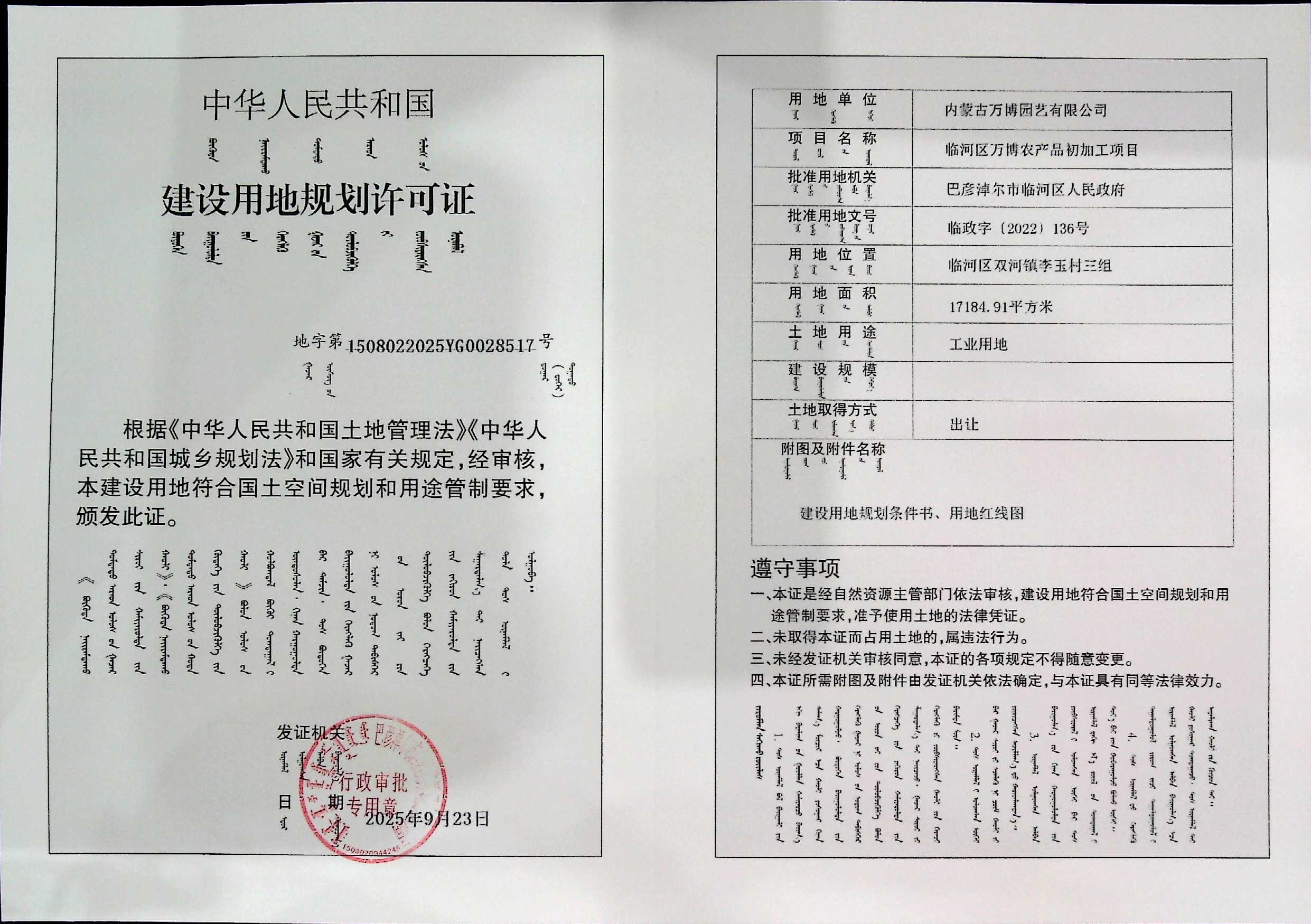 内蒙古万博园艺有限公司临河区万博农产品初加工项目(建设用地规划许可证)
