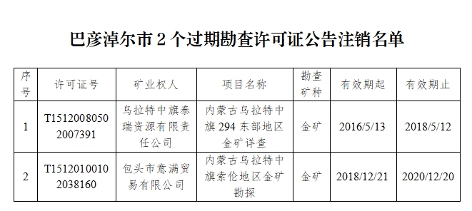 巴彦淖尔市自然资源局关于拟对内蒙古乌拉特中旗294东部地区金矿详查等2个勘查许可证予以注销的公示