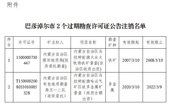 根据《矿产资源勘查区块登记管理办法》(国务院令第240号)、《自然资源部关于进一步完善矿产资源勘查开采登记管理的通知》(自然资规〔2023〕4号)第十八条之规定,“内蒙古自治区乌拉特前旗大佘太牧场铁矿普查(自治区政府出资)”、“内蒙古自治区乌拉特前旗哈必气矿区铁多金属矿普查(政府全额出资)”勘查许可证在有效期届满前因矿权人自身原因未按规定提出延续申请,勘查许可证拟予以注销,现进行公示。