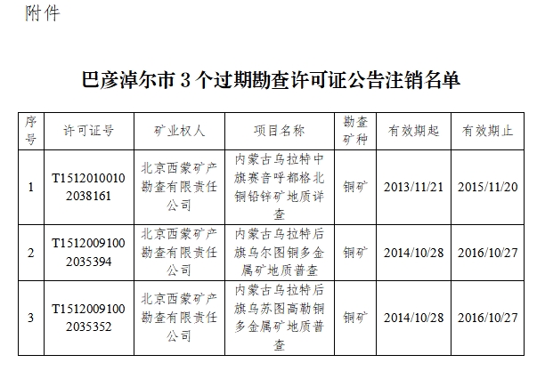 你公司持有的内蒙古乌拉特中旗赛音呼都格北铜铅锌矿地质详查探矿权,勘查许可证号T15120100102038161,有效期限2013年11月21日至2015年11月20日;内蒙古乌拉特后旗乌尔图铜多金属矿地质普查探矿权,勘查许可证号T15120091002035394,有效期限2014年10月28日至2016年10月27日;内蒙古乌拉特后旗乌苏图高勒铜多金属矿地质普查探矿权,勘查许可证号T15120091002035352,有效期限2014年10月28日至2016年10月27日。在有效期届满前因矿权人自身原因未按规定提出延续申请,按照《矿产资源勘查区块登记管理办法》(国务院令第240号)、《自然资源部关于进一步完善矿产资源勘查开采登记管理的通知》(自然资规〔2023〕4号)、《内蒙古自治区自然资源厅关于加快清理过期矿业权数据的通知》(内自然资字〔2025〕131号)有关规定,勘查许可证拟予以公告注销。