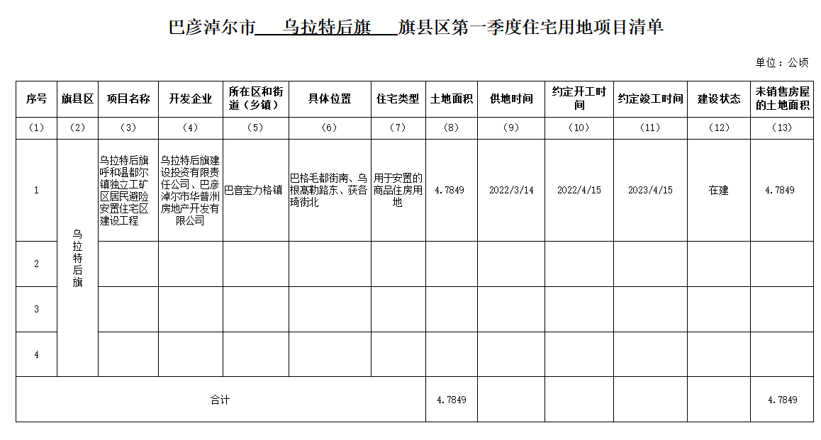 乌拉特后旗2022年第一季度存量住宅用地项目信息