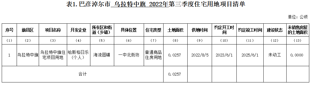 乌拉特中旗2022年第三季度存量住宅用地项目信息
