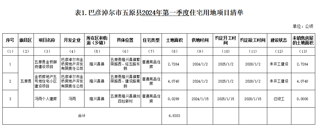 巴彦淖尔市五原县2024年第一季度住宅用地项目信息